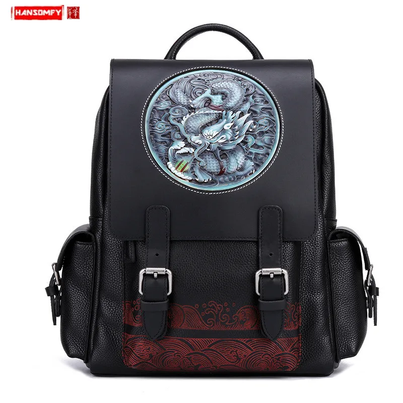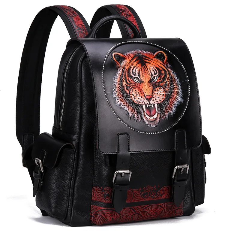 2020 New men Backpack Men's Handmade Leather Carved dragon Tiger Head travel Backpacks Cowhide leat